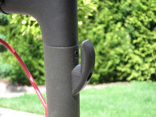 Sam montaż trwa około 30 sekund. Wystarczy odkręcić jedną ze śrub przy kierownicy, przełożyć ją przez otwór w wieszaku a następnie ponownie przykręcić.
