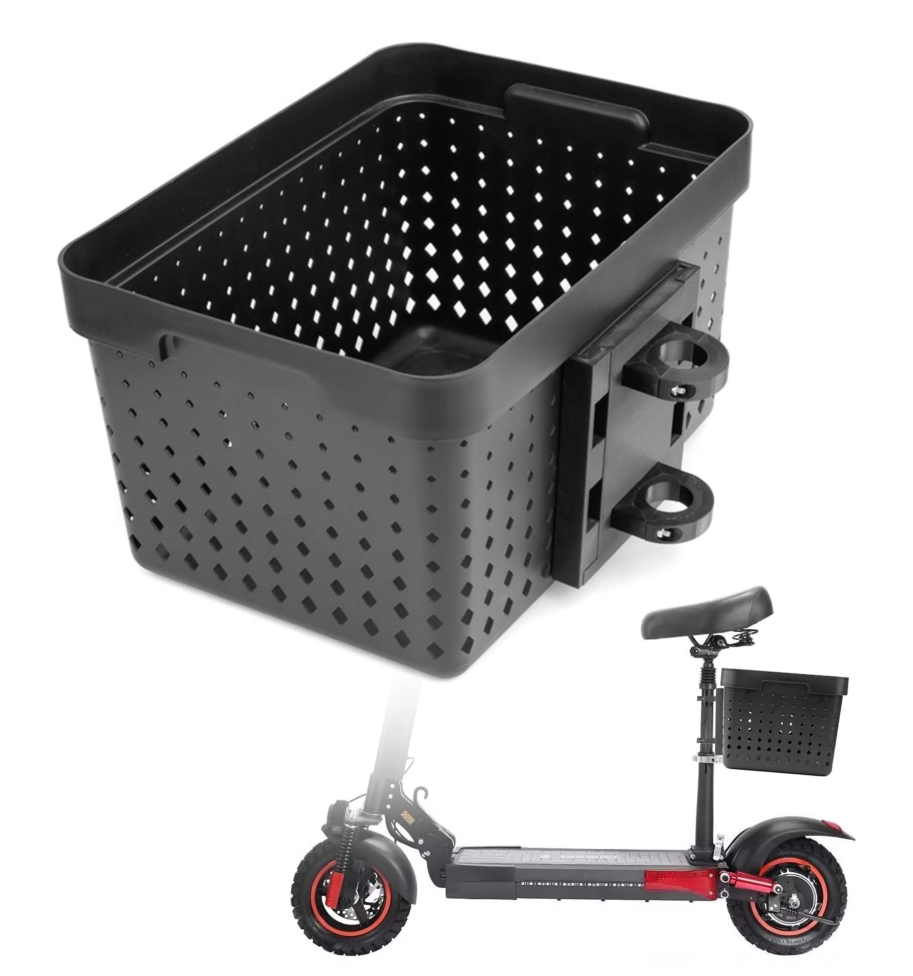 (Zdjęcia przedstawiają kosz zamontowany na przykładowej hulajnodze innej marki. Sprzedawany produkt jest dostarczany z kompletem obejm dostosowanych do hulajnogi podanej w opisie oferty)