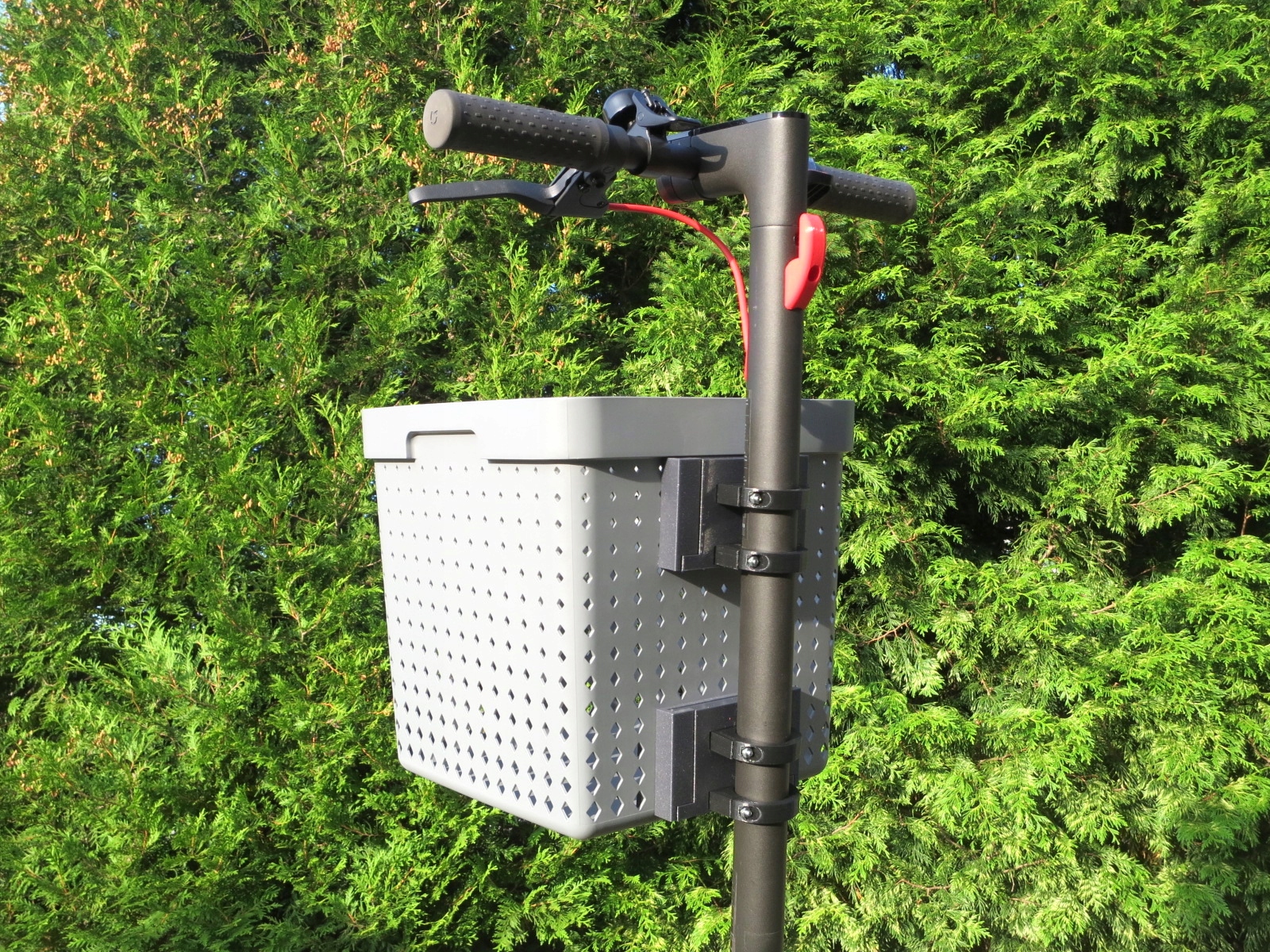 (Zdjęcia przedstawiają kosz zamontowany na przykładowej hulajnodze innej marki. Sprzedawany produkt jest dostarczany z kompletem obejm dostosowanych do hulajnogi podanej w opisie oferty)