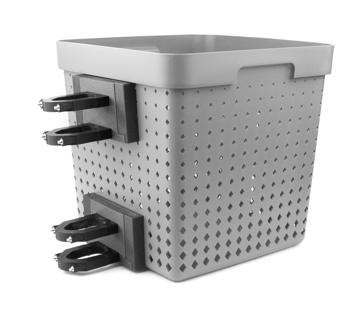 (Zdjęcia przedstawiają kosz zamontowany na przykładowej hulajnodze innej marki. Sprzedawany produkt jest dostarczany z kompletem obejm dostosowanych do hulajnogi podanej w opisie oferty)
