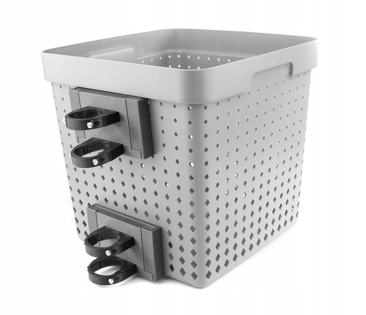 (Zdjęcia przedstawiają kosz zamontowany na przykładowej hulajnodze innej marki. Sprzedawany produkt jest dostarczany z kompletem obejm dostosowanych do hulajnogi podanej w opisie oferty)