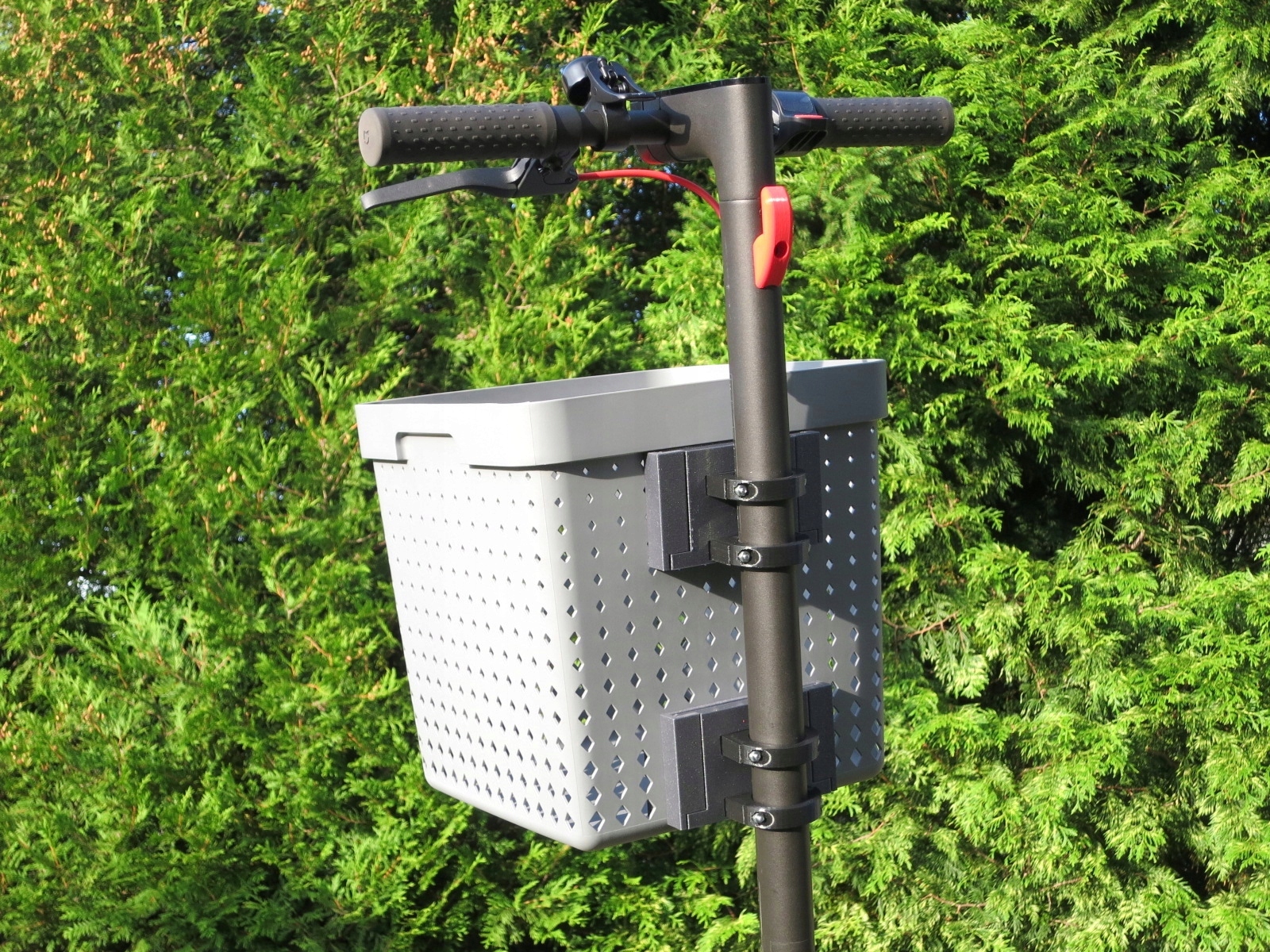 (Zdjęcia przedstawiają kosz zamontowany na przykładowej hulajnodze innej marki. Sprzedawany produkt jest dostarczany z kompletem obejm dostosowanych do hulajnogi podanej w opisie oferty)