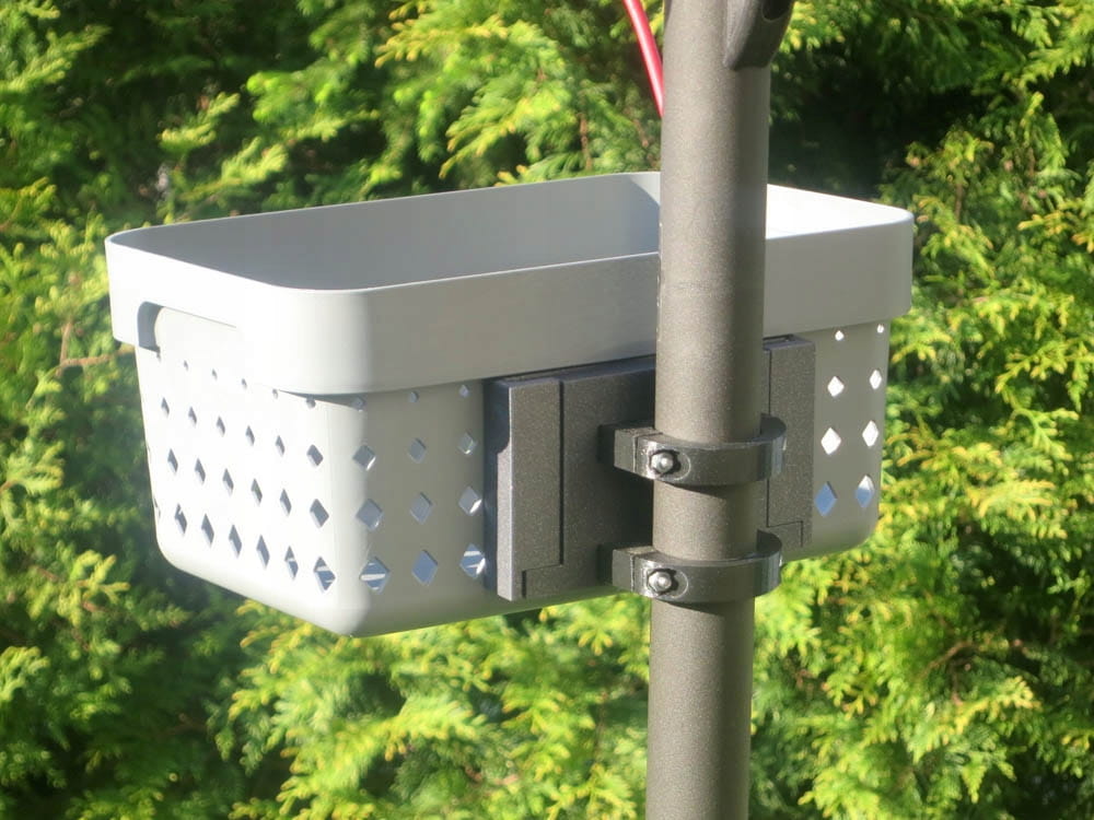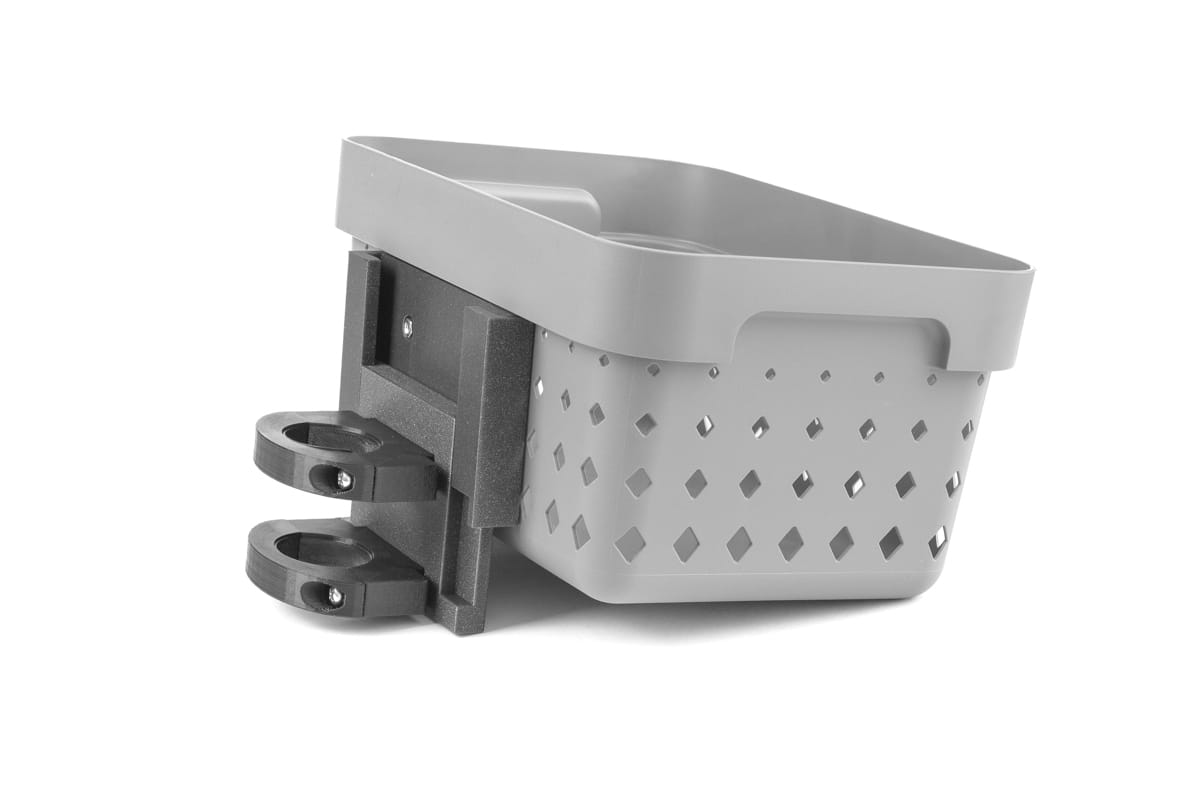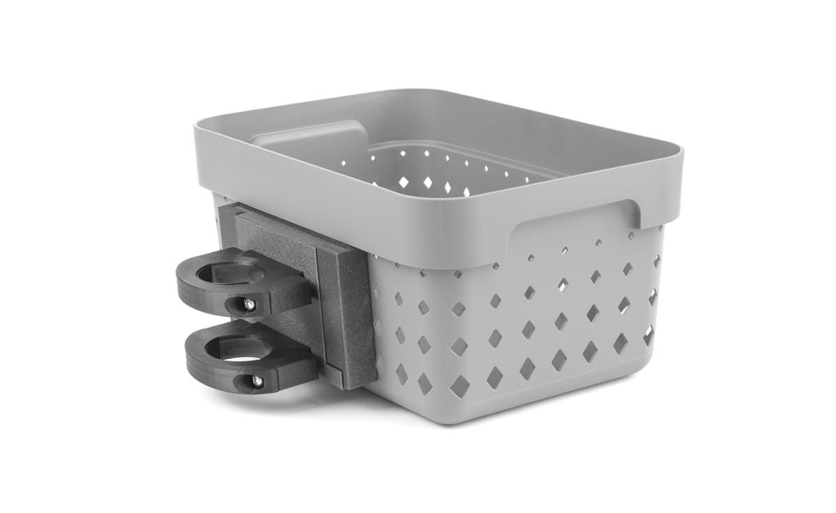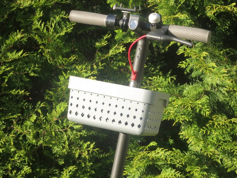(Zdjęcia przedstawiają kosz zamontowany na przykładowej hulajnodze innej marki. Sprzedawany produkt jest dostarczany z kompletem obejm dostosowanych do hulajnogi podanej w opisie oferty)