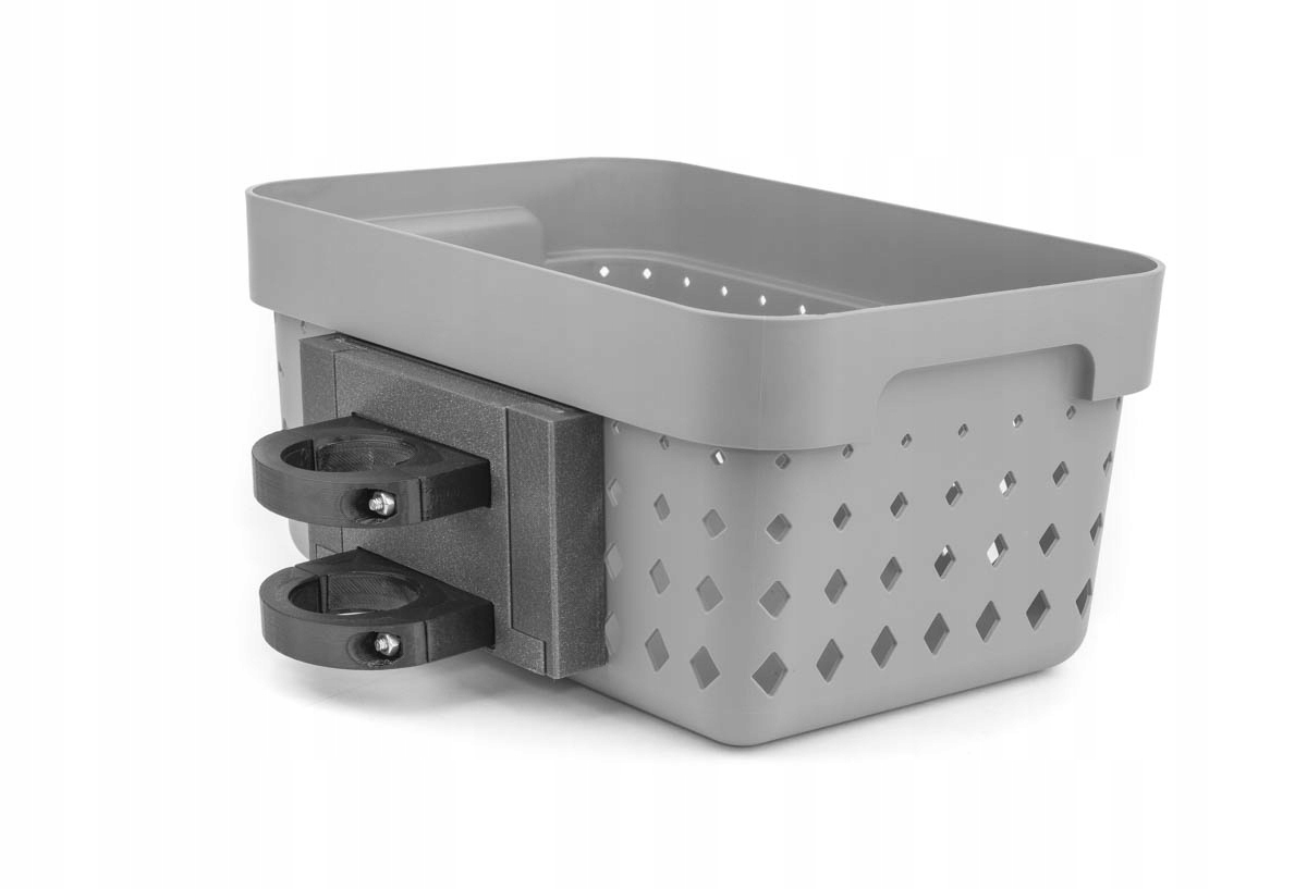(Zdjęcia przedstawiają kosz zamontowany na przykładowej hulajnodze innej marki. Sprzedawany produkt jest dostarczany z kompletem obejm dostosowanych do hulajnogi podanej w opisie oferty)